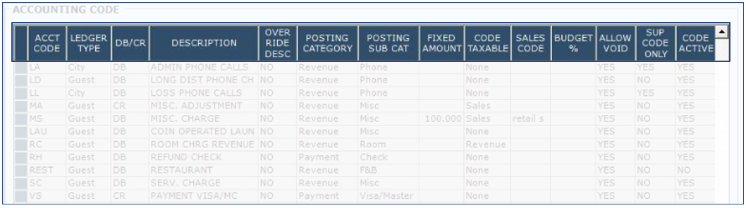 This page will show the list of the accounting codes and any G/L accounts assigned to those codes.