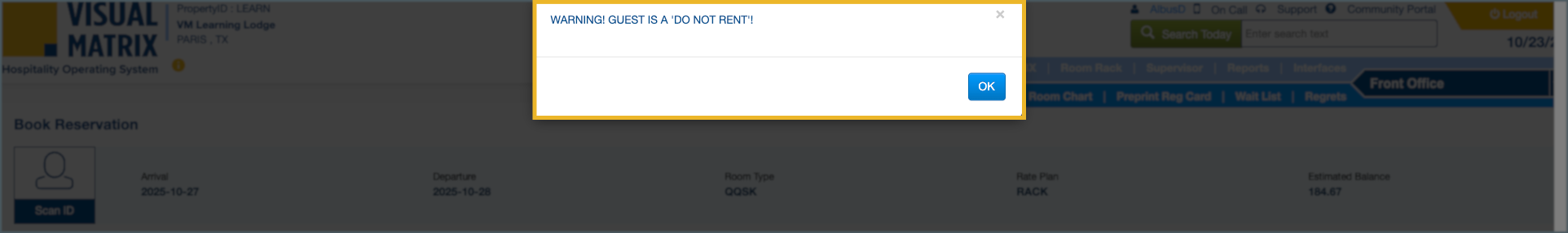 Managing guest behavior sometimes requires restricting future stays for specific individuals. Visual Matrix Cloud allows you to apply a Do Not Rent (DNR) status to a guest profile, alerting staff whenever a reservation or check-in is attempted for that guest. These system warnings help prevent accidental bookings and ensure the front desk is aware of the restriction before allowing the stay to proceed.