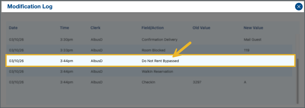 If staff continue with the reservation or check-in despite the warning, the action is recorded in the Reservation Modification Log (Res Mod Log) along with the user who approved the action.