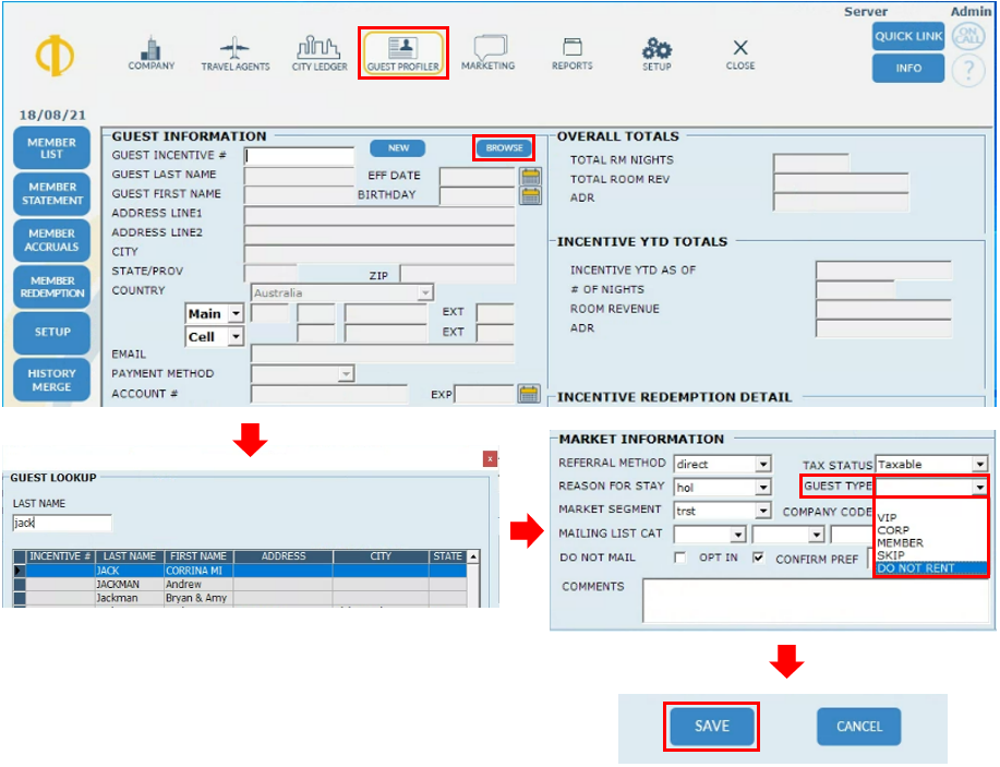 The Guest Profiler section in Sales and Marketing gives you the possibility to update a Guest Profile Type with a specific Status like VIP, Member, or Do Not Rent.