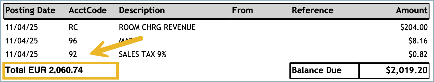 - Display Purpose Only: The converted total is for informational purposes and does not affect the actual folio balance or payments.