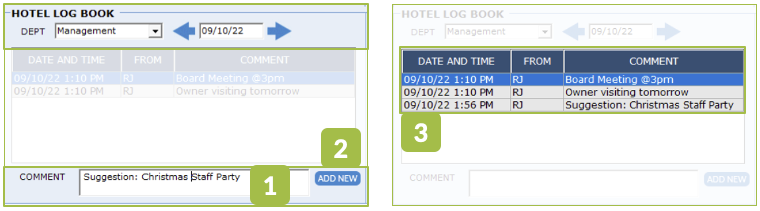 The Hotel Log Book is one of the 4 widgets you can find in the Info section of Visual Matrix. The logbook works by each department by day. It is meant for communication inside one department, not between departments. See how to add a log to the ...