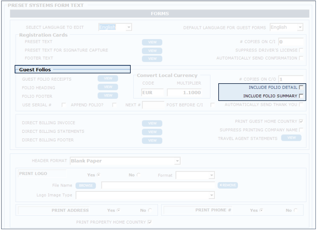 This option will automatically print a set up number of folio(s) at check out. Path: Management > Setup > Property > Forms Enter the number of folio copies to print at check out in the designated field below. If you do not wish to print automatically ...