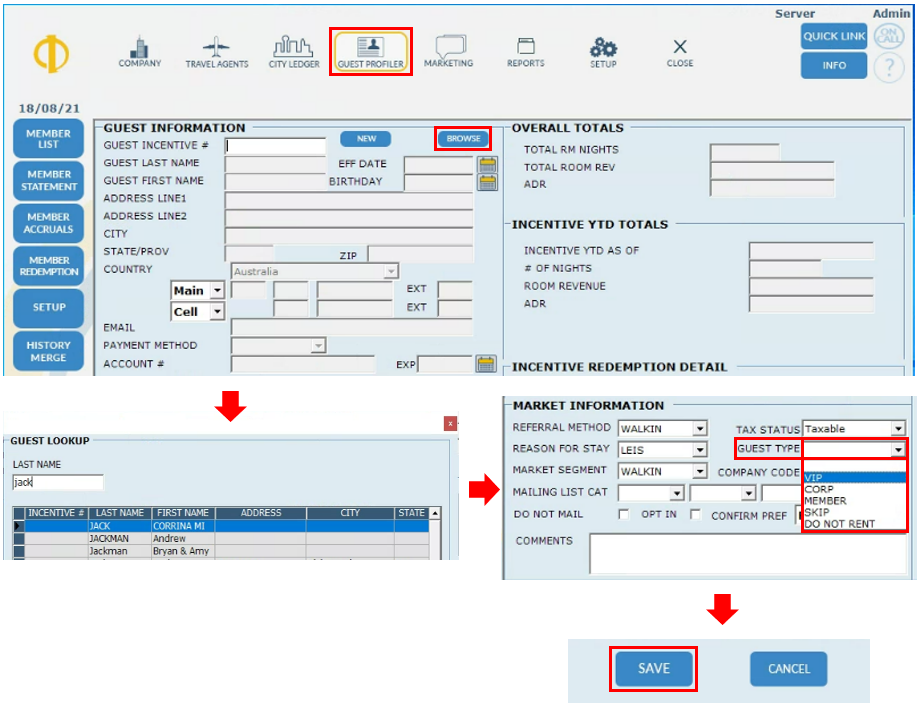 The Guest Profiler section in Sales and Marketing gives you the possibility to update a Guest Profile Type with a specific Status like VIP, Member, or Do Not Rent.
