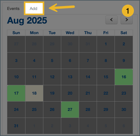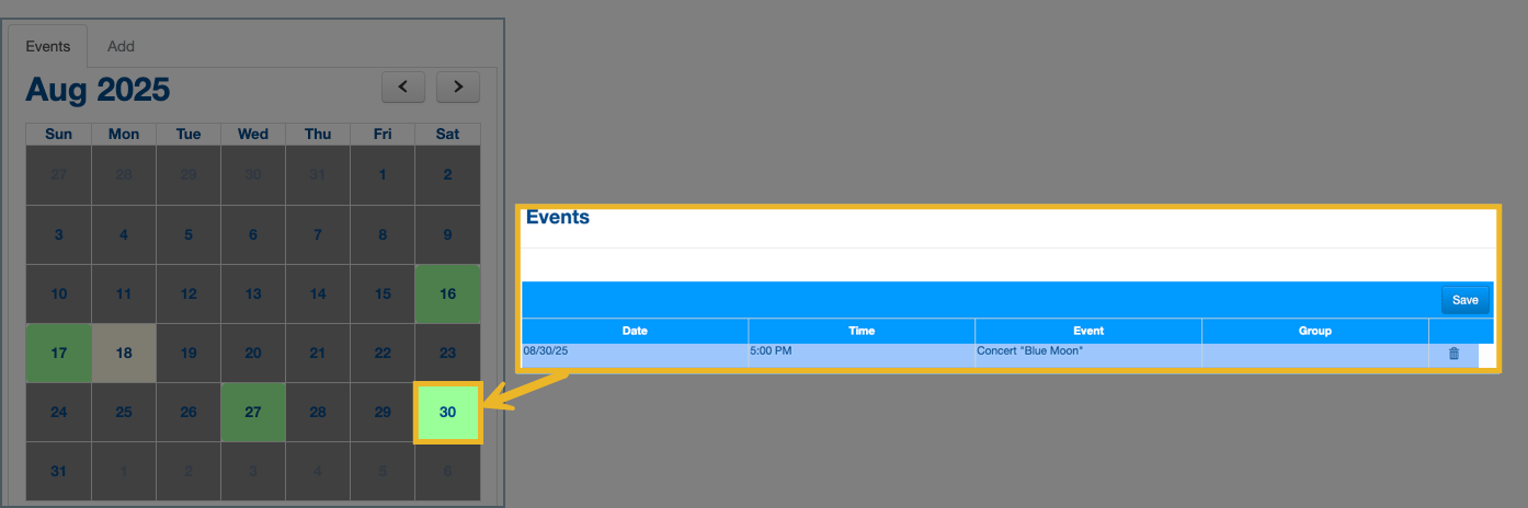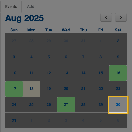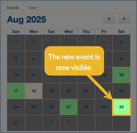 4. Your event now appears on the Events Calendar—dates with events are highlighted in green.