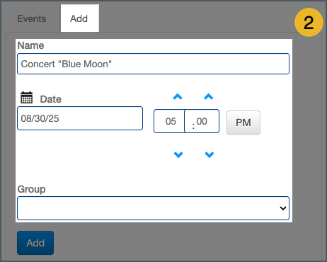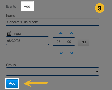 2. Fill out the event name, date, and time. If it relates to a group reservation, select the group from the dropdown (only groups arriving that day appear here).