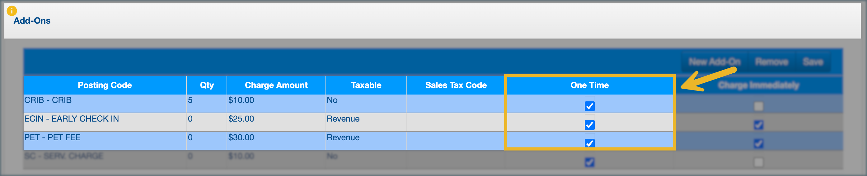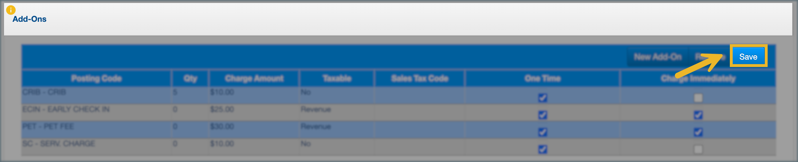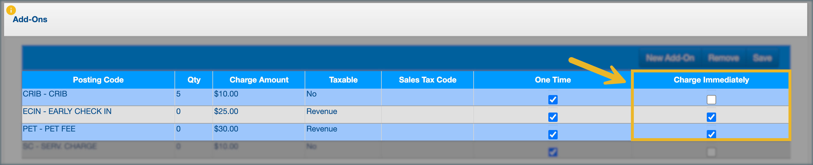- Charge Immediately: Posts the charge to the folio as soon as the add-on is applied instead of waiting for nightly processing.