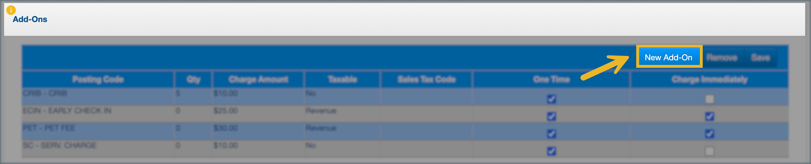 1. Click New Add-On. A blank row appears at the top of the list where you can enter the new add-on details.