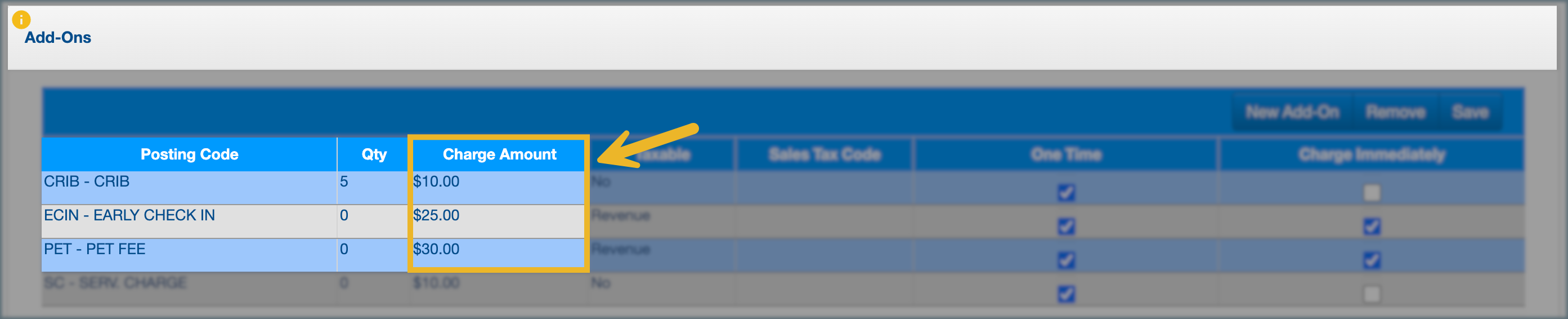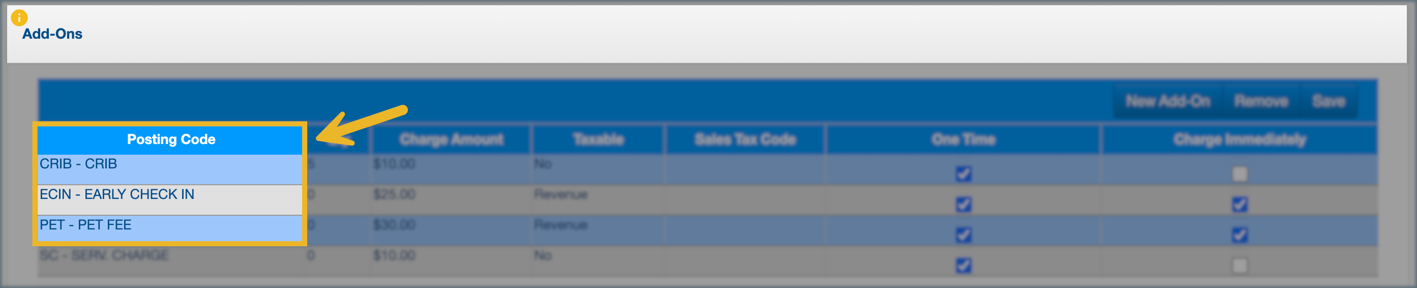 - Posting Code: Determines the add-on name and links the charge to the correct accounting category.