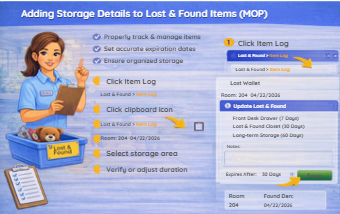 Efficient Lost & Found management is essential for maintaining organization and improving guest satisfaction. MOP allows properties to configure multiple storage areas, each with a defined maximum storage duration. This ensures items are: Properly ...
