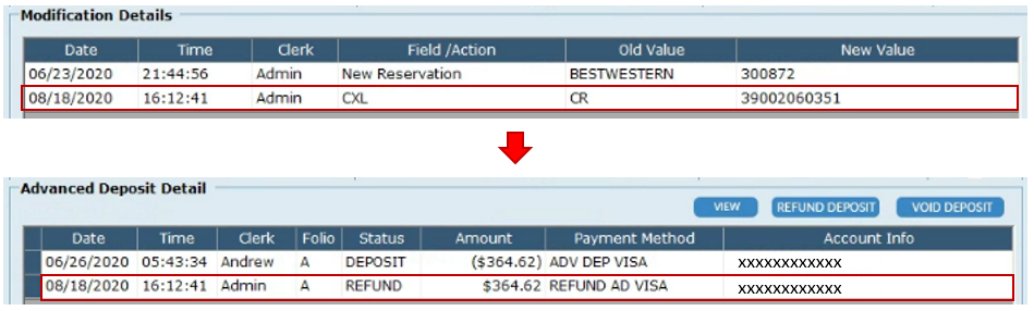 Cancellation made Online with an Advance Deposit posted on the Reservation