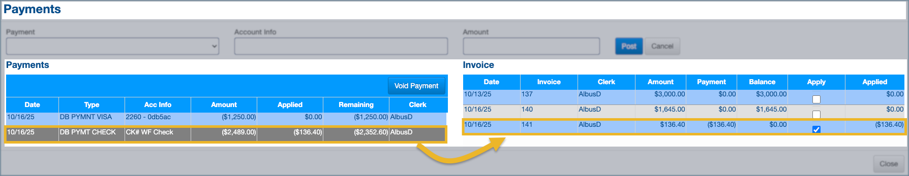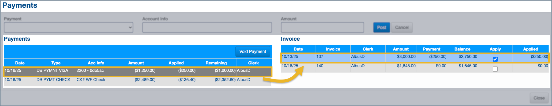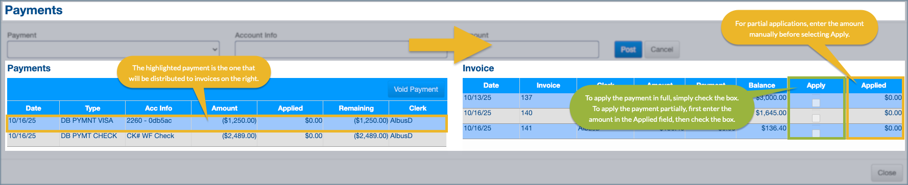 - If the payment is to be partially applied, first enter the amount to apply in the Applied field, and then check the Apply box.