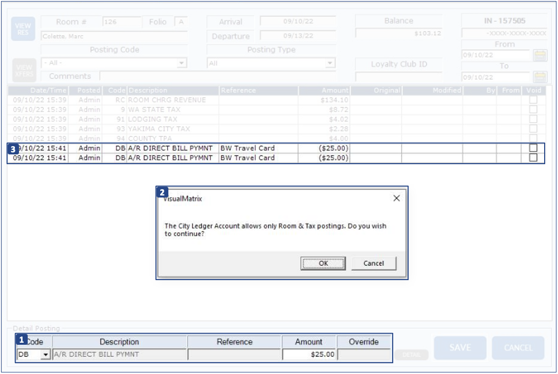 Path: Front Office > Cashiering > Open a folio 1. From Details Posting, post the accounting code DB (direct bill). 2. The DB will post to the CL account already selected as the method of payment on the reservation screen. 3. A dialogue box will ...
