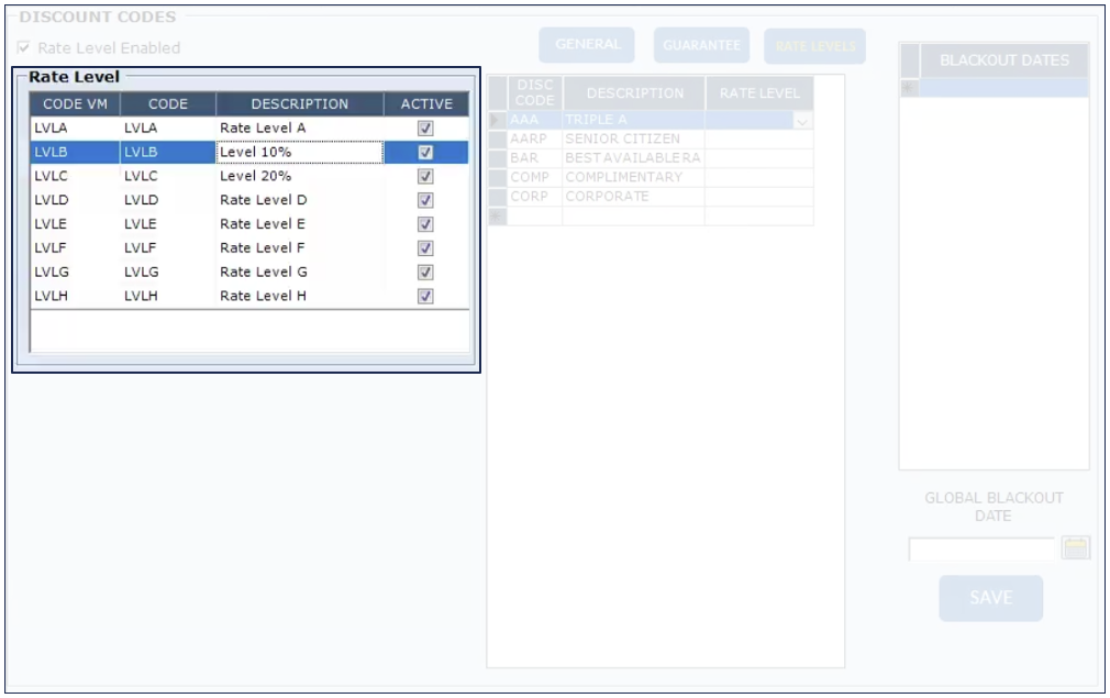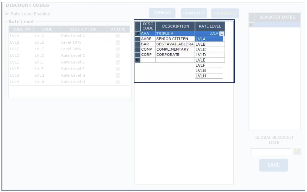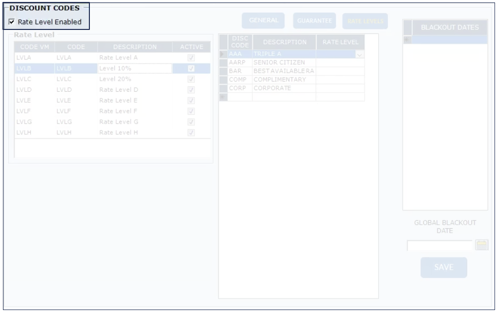 Rate Levels are used to group together rate codes by categories (aka Levels). Closing a rate level means that closing all the discount codes included in this level at once for online sales.