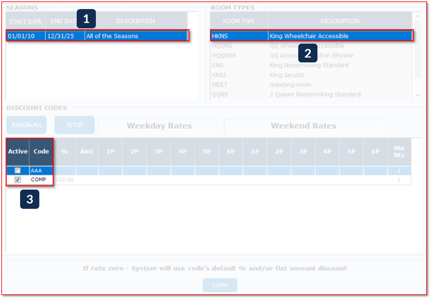 3. Select Active on the Discount codes you would like active for that selected room type during that selected season.