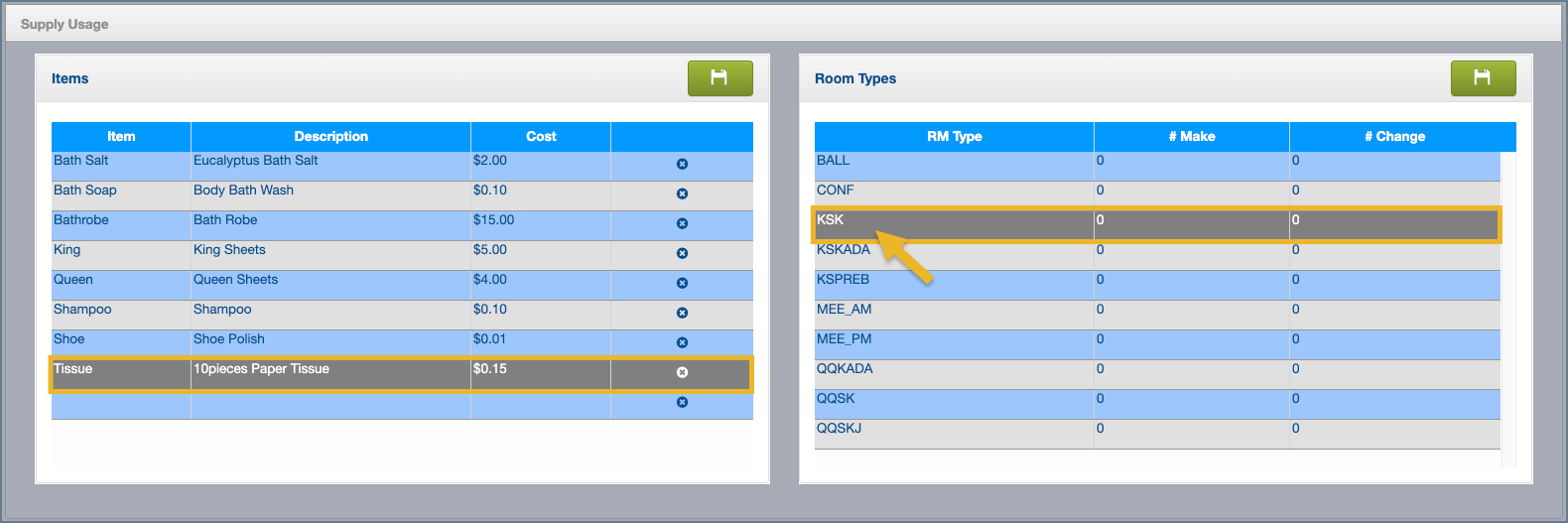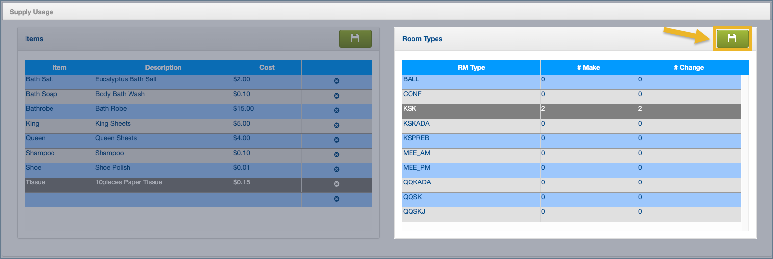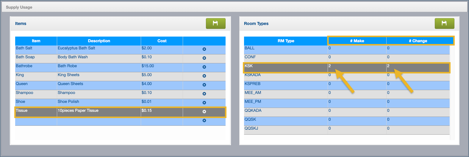 3. Enter the number of supply units needed for that room type when the room is cleaned as a Make and as a Change.