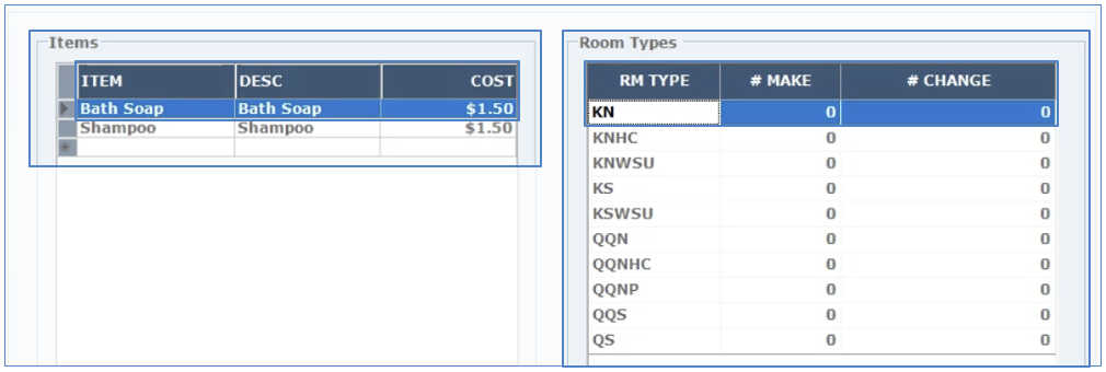 3. Enter the number of items needed for this room type when the room is cleaned as Make and as Change. Repeat for each room type.
