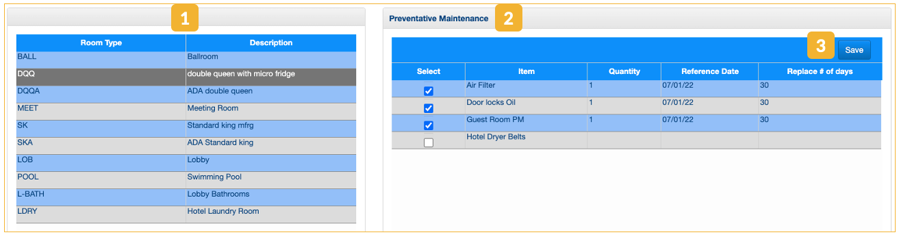 2. Check the item to assign to this room type and complete the number of item per room/area, the date the item is entered and the frequency it needs to be maintained.