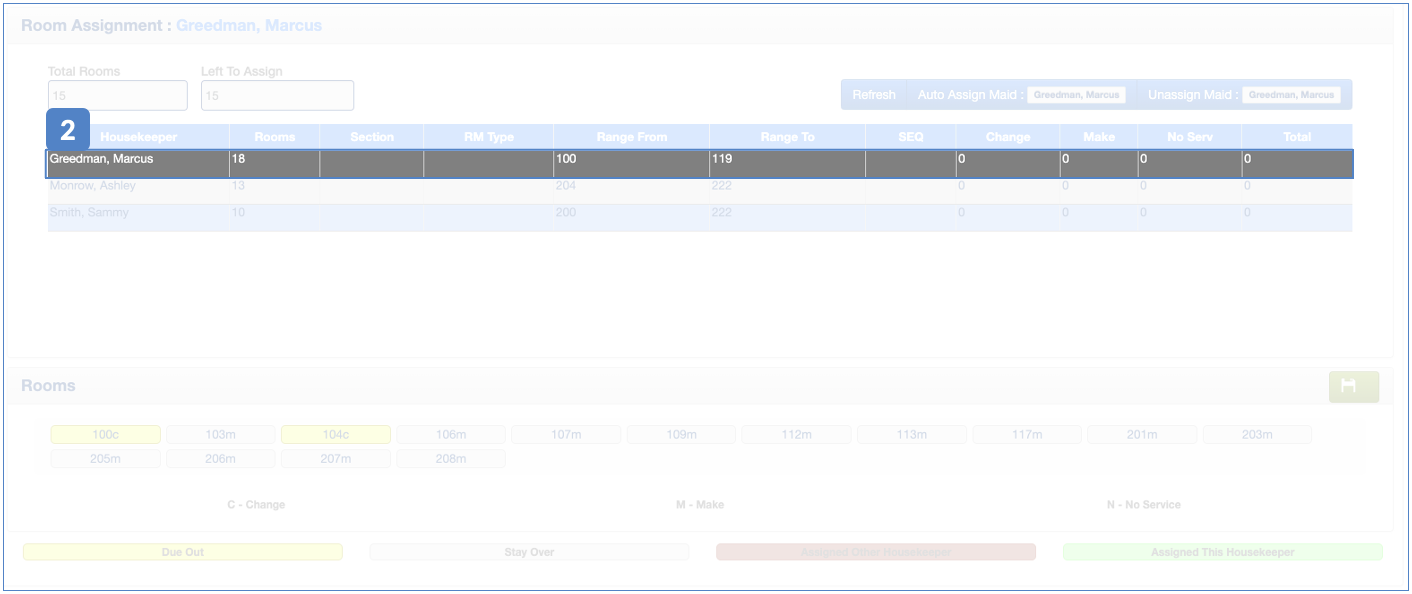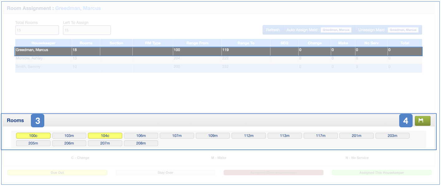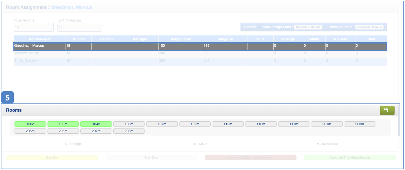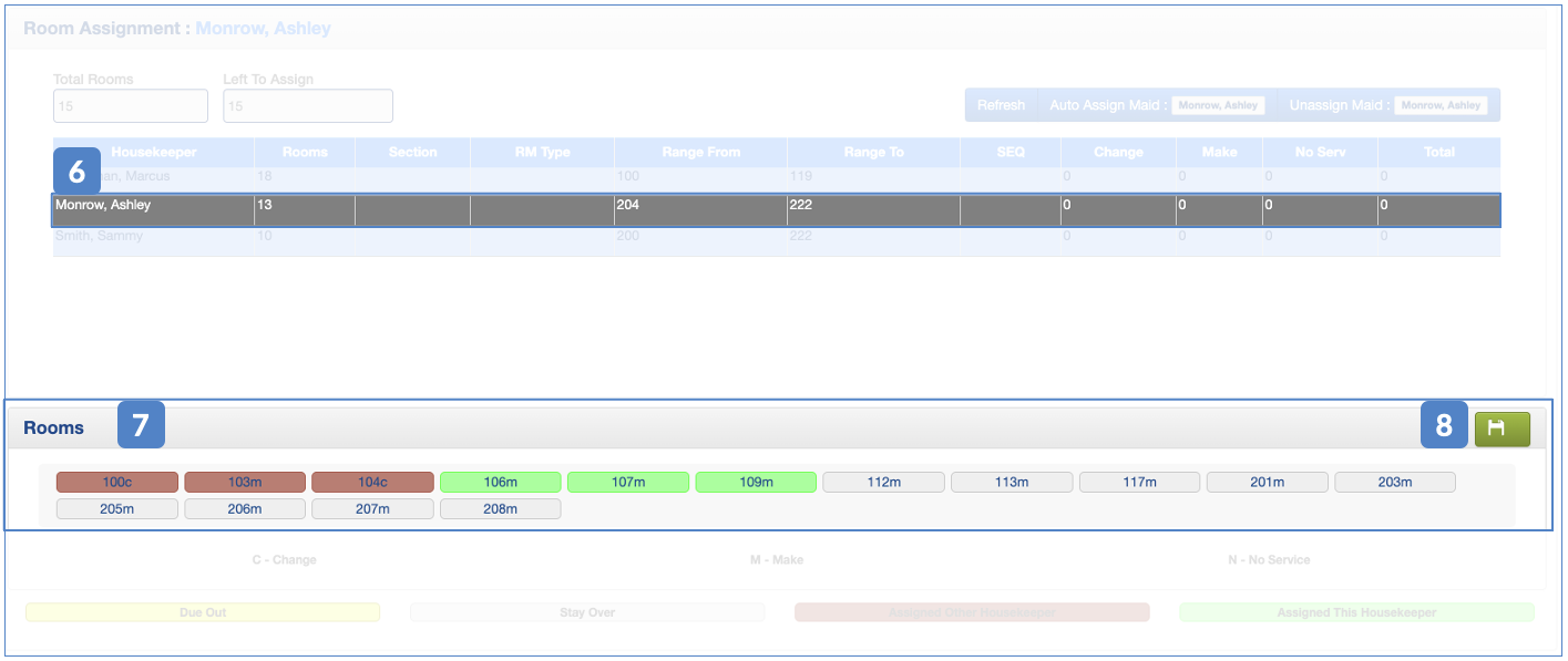 Room numbers in green are assigned to the selected housekeeper. Room numbers in red are already assigned to another housekeeper.
