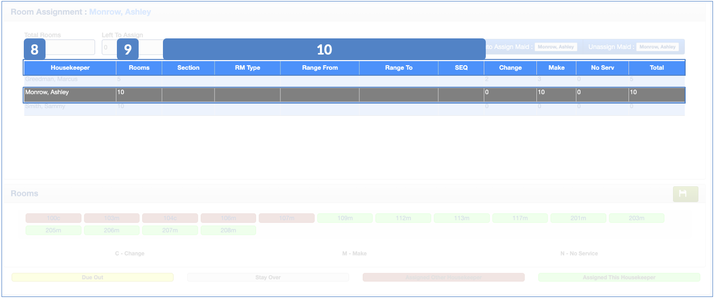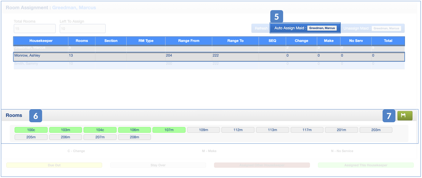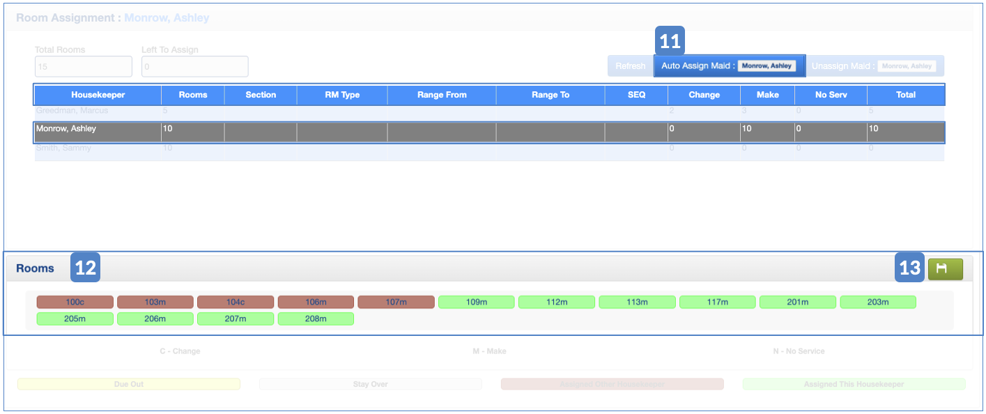 12. The system will assign the following "x" room number entered next to the housekeeper's name (# Rooms). Rooms in red are already assigned to another housekeeper.