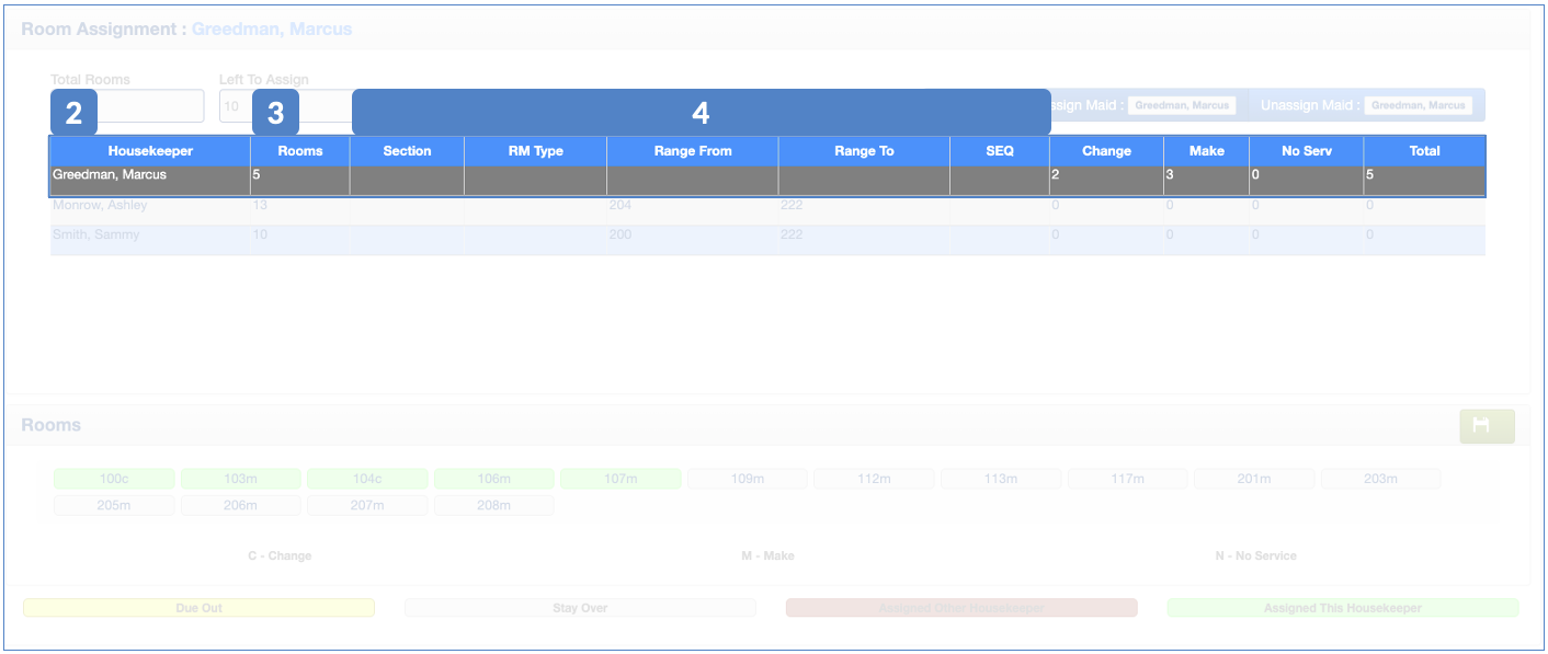 Room numbers in yellow are Due Outs. Room numbers in white are Stay Overs. Room numbers in green are assigned to the selected housekeeper. Room numbers in red are already assigned to another housekeeper.