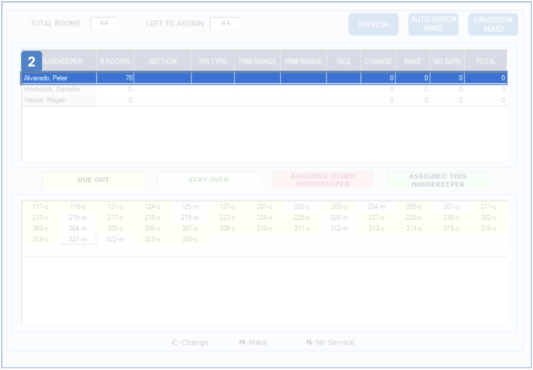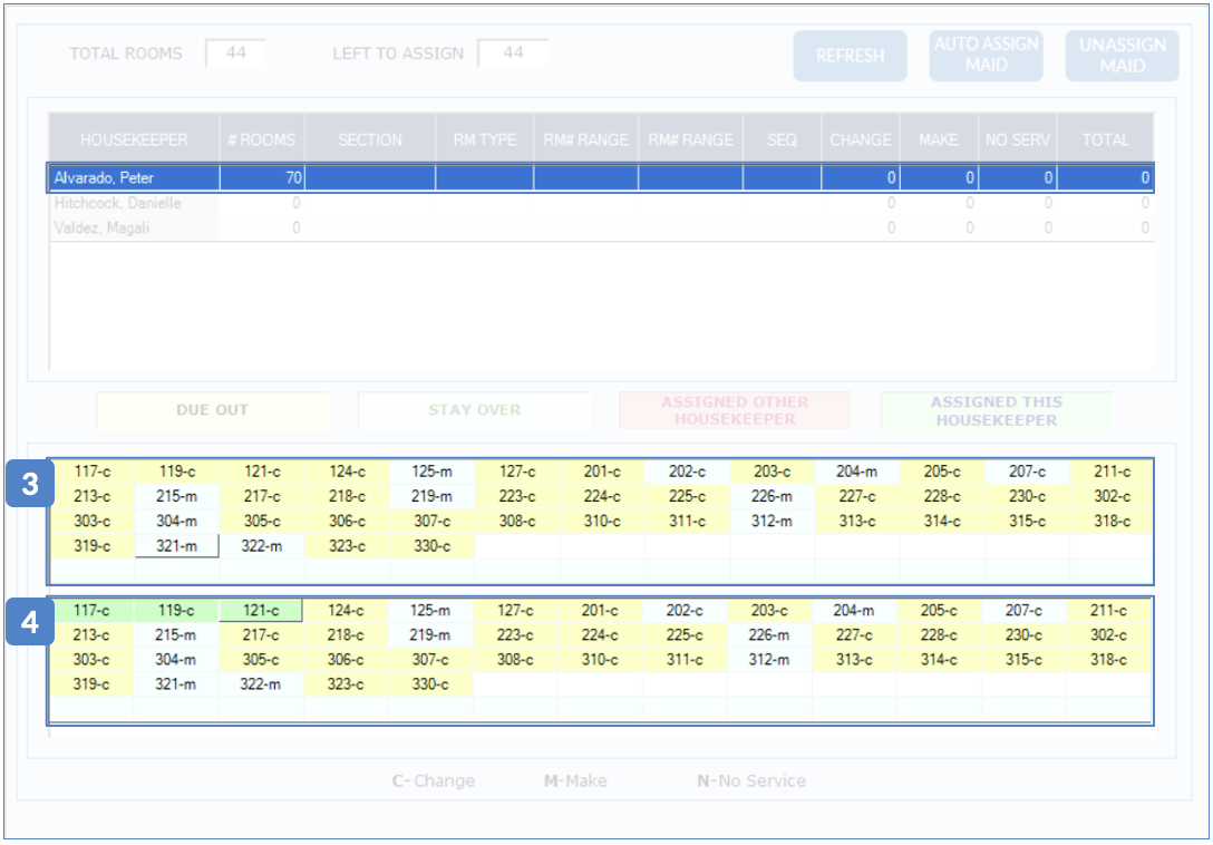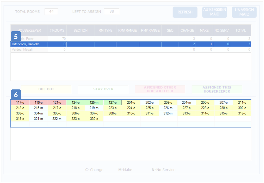 Room numbers in green are assigned to the selected houskeeper. Room numbers in red are already assigned to another housekeeper.