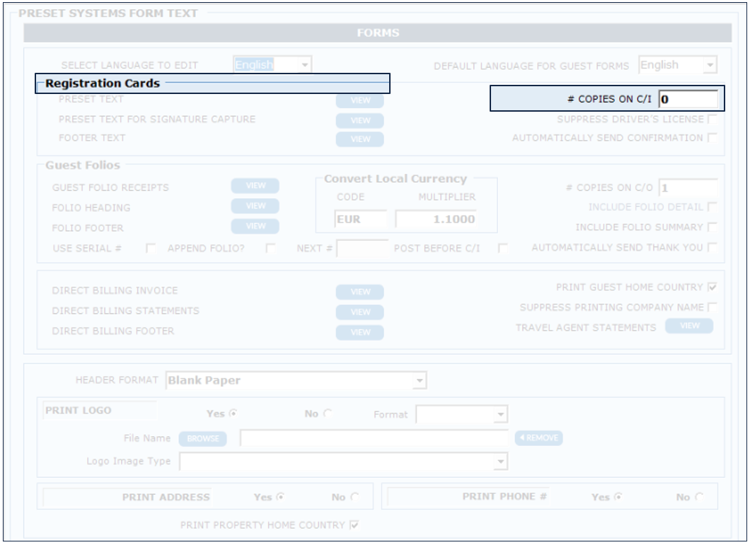 Enter the number of registration card copies to print at check-in in the designated field below. If you do not wish to print reg cards automatically at check in, enter "0".