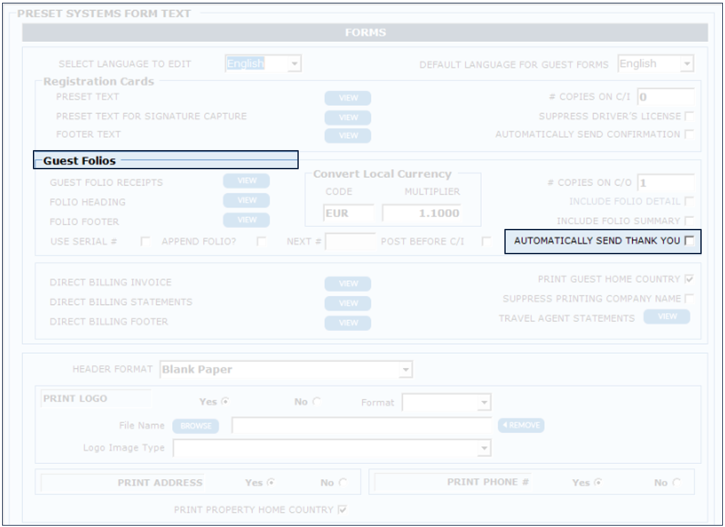 This option works in conjunction with the Thank You letter in the Night Audit Automatic Guest Correspondance settings, where the letter has to be setup first. Instead of waiting to send the letter at check out time, this option will send the letter once check out is completed.