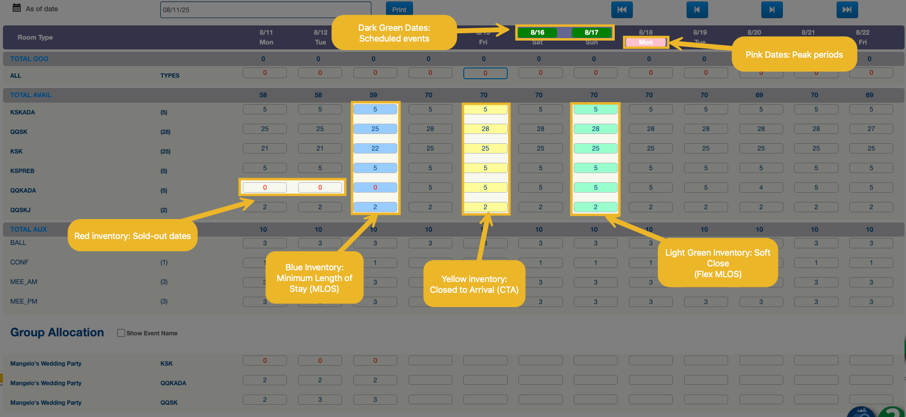 In the Availability screens (Reservations or Group → Availability), you not only see the general room availability and restrictions (MLOS, Soft/HARD Close, CTA), but also group allocations for future dates. These allocations represent rooms reserved ...