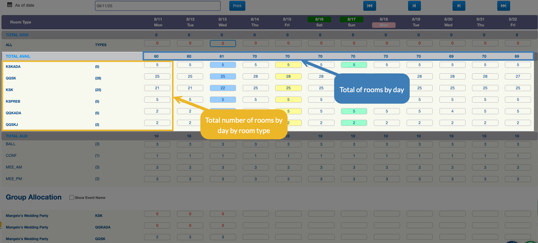 This section shows inventory by room type, including the total number of rooms for each type and a daily breakdown of remaining availability. The overall total of available rooms for each day appears at the top of the column.