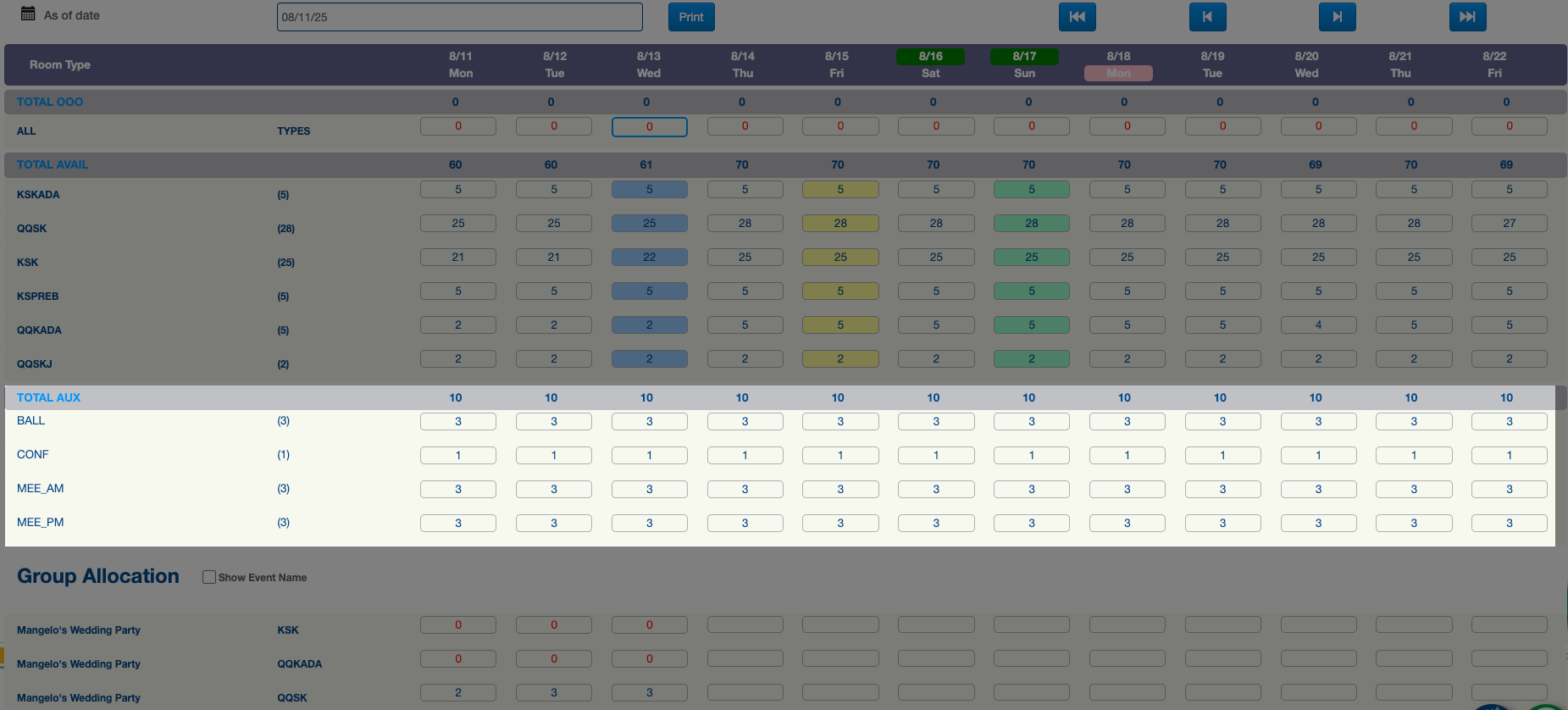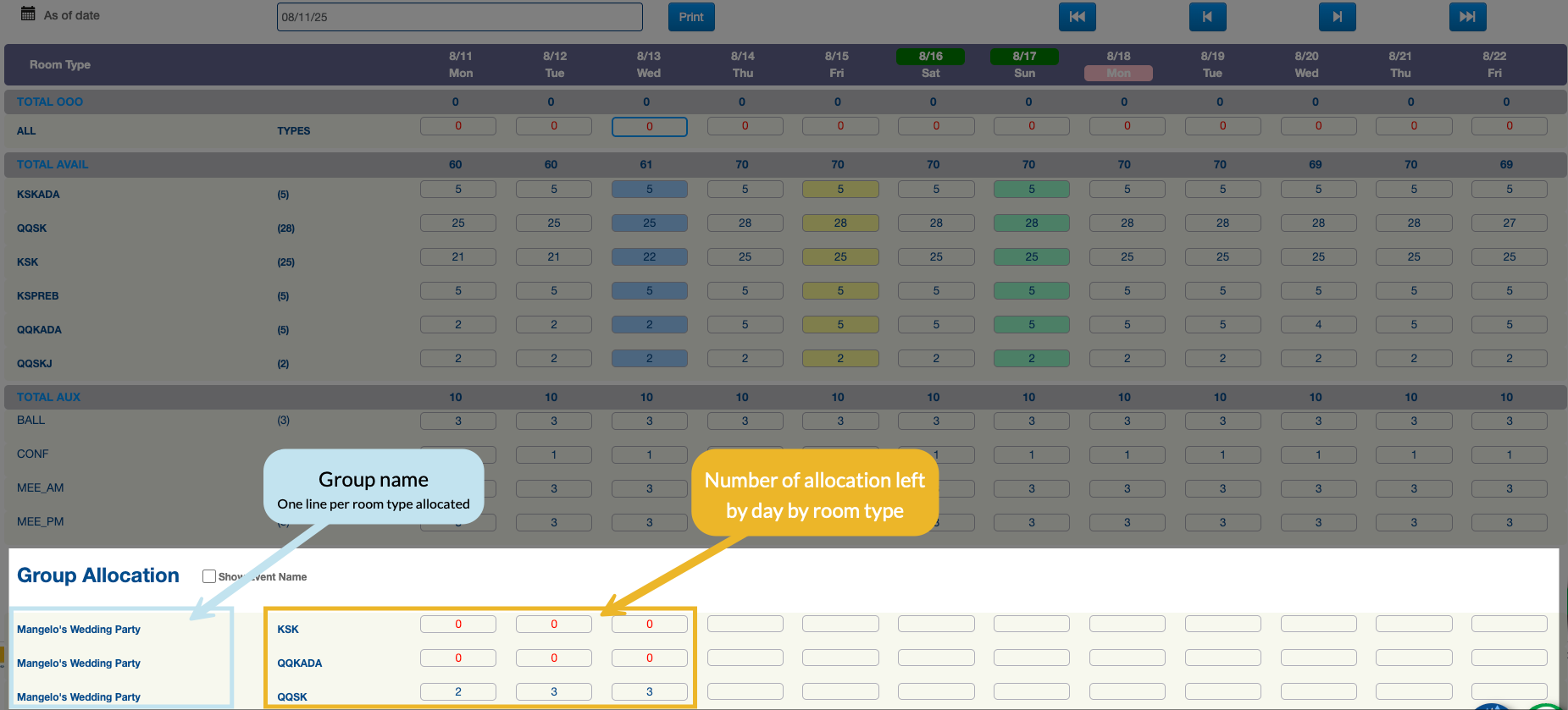 Group allocations are an important part of managing inventory. This section shows the remaining allocated rooms by group and room type, with these allocations already deducted from the totals above. If multiple groups share the same name, enabling Show Event Name will display the event for easier identification.