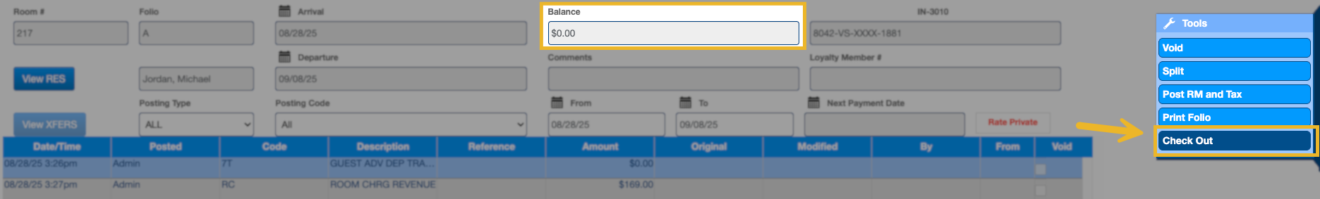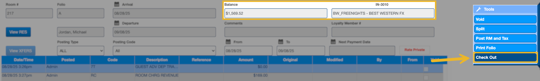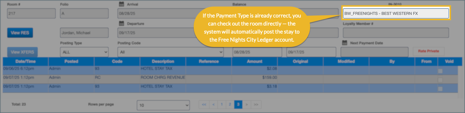 If the Payment Type is already set to City Ledger and linked to the Free Nights account, you can check out the room directly. The system will automatically post the stay to the Free Nights City Ledger account and complete the check-out.