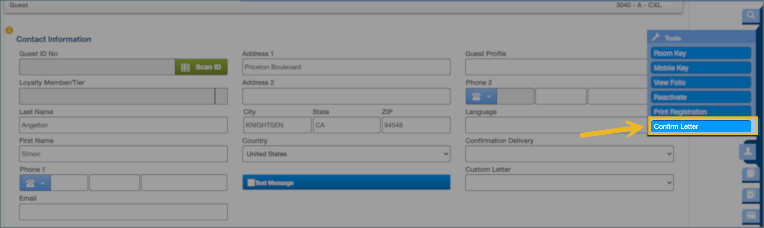 7. To send a cancellation confirmation to the guest, go to the Toolbox panel and click Confirm Letter. If an email address is on file, the letter will be sent automatically; otherwise, it can be printed.
