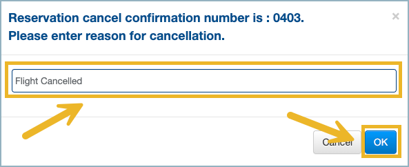 4. In the cancellation window, type a clear reason for the cancellation (for example: “Guest cancelled after policy period” or “Reservation booked in error”).