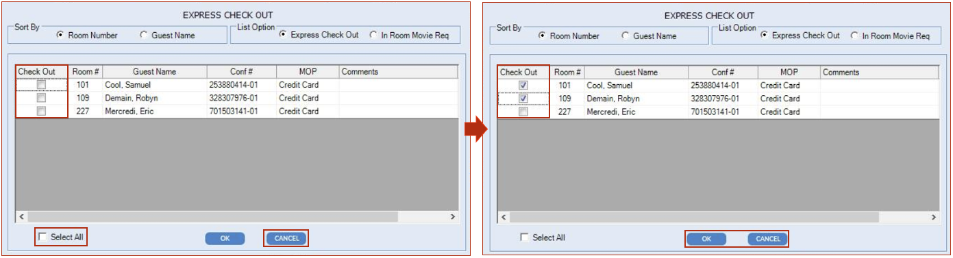 The Express Check-Out feature is meant to check out everyone at one time that is supposed to check out that day and whose folio balance is at $0.