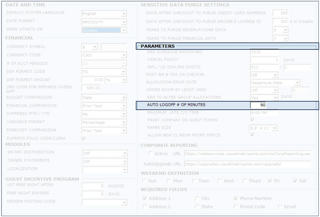Enter 0 to disable the auto-logoff (not advised). Visual Matrix does advise a number between 10 and 40 minutes.