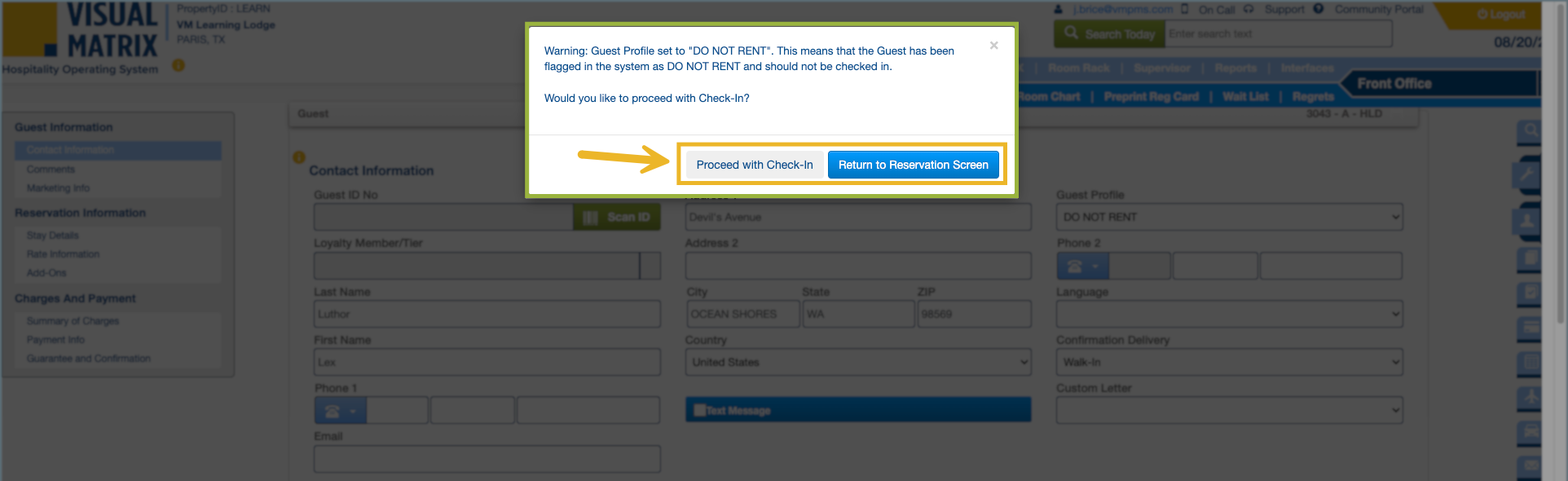 This pop-up must be acknowledged before you can continue check-in, reminding you that the guest profile is marked “Do Not Rent".