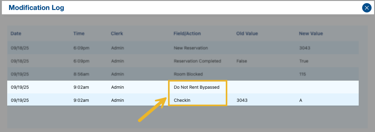 2. If you proceed with check-in despite the “Do Not Rent” status, Visual Matrix records a bypass in the Reservation Modification Log (“Res Mod Log”). The entry will name the user who approved it, helping maintain an auditable trail.