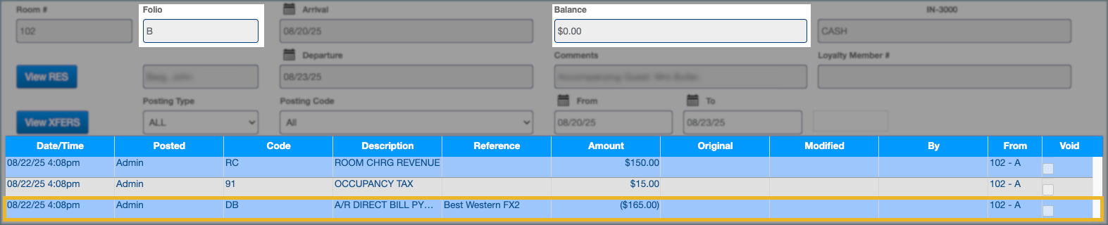 8. During the night audit, Room and Tax will post to Folio A, completing the full revenue for that day. Since you already handled the reimbursement on Folio B, you won’t need to take any action on Folio B at check-out.