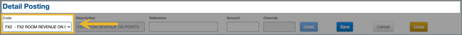 6. In the B Folio, open Detail Posting and select the FX2 Room Revenue account. Post the reimbursement amount calculated via the Best Western FX2 Reimbursement Calculator, based on the number of points redeemed (as indicated in the CRS Comments).