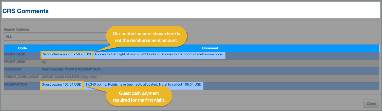 2. Review the “CRS Comments” section and confirm whether the guest owes an additional first-night payment beyond the points redeemed.