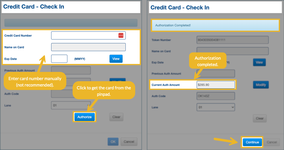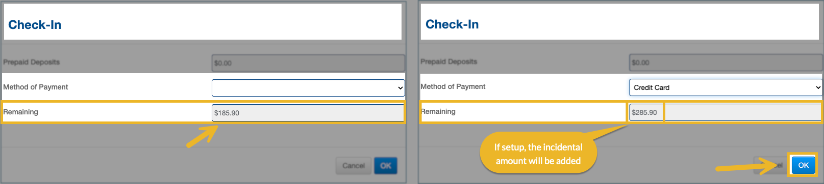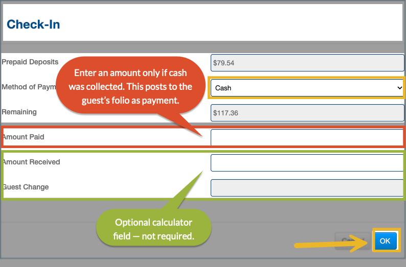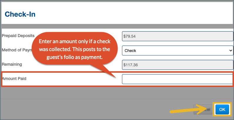 Only one payment method can be used during check-in. If a guest wants to split the payment between multiple methods, complete check-in with a single method first, then post the additional payments directly to the folio.