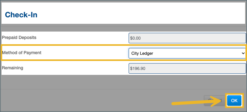 Visual Matrix Cloud supports several payment methods at check-in: Cash, Check, City Ledger, and Credit Card. Following the correct method will ensure payments post to the right folio, that accounting is accurate, and your property policies are followed.