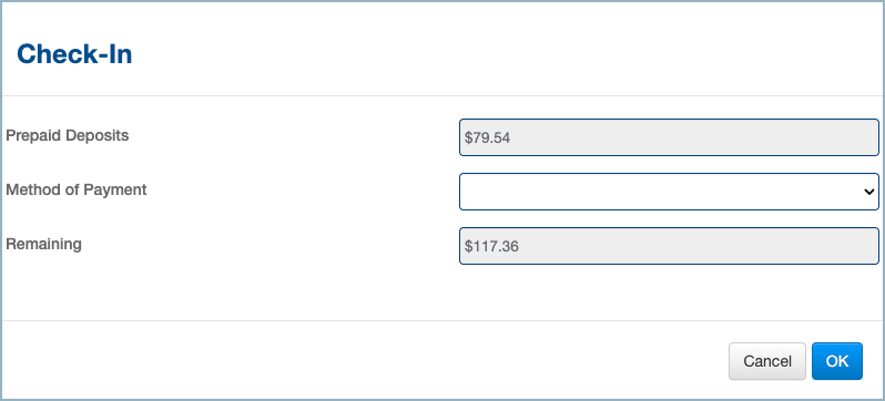 2. Any prepaid deposit will show, as well as the remaining amount to be paid. Select the method of payment.