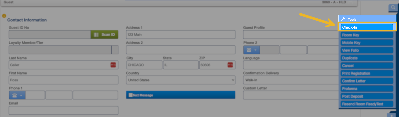 1. Review guest details (room type, rate, arrival/departure) and select "Check-In" from the Toolbox on the right.