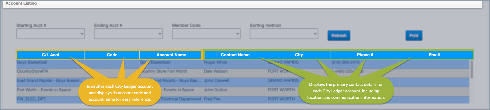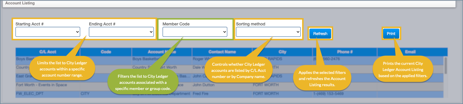 The top section of the City Ledger Account Listing allows you to control which accounts appear in the list and how they are displayed. Filters can be used to narrow results to a specific range of accounts, member codes, or sorting preferences before refreshing the list. Once filters are applied, the results can also be printed for reference or reporting. This area is typically used to reduce large account lists into a manageable view before reviewing balances or opening account details.