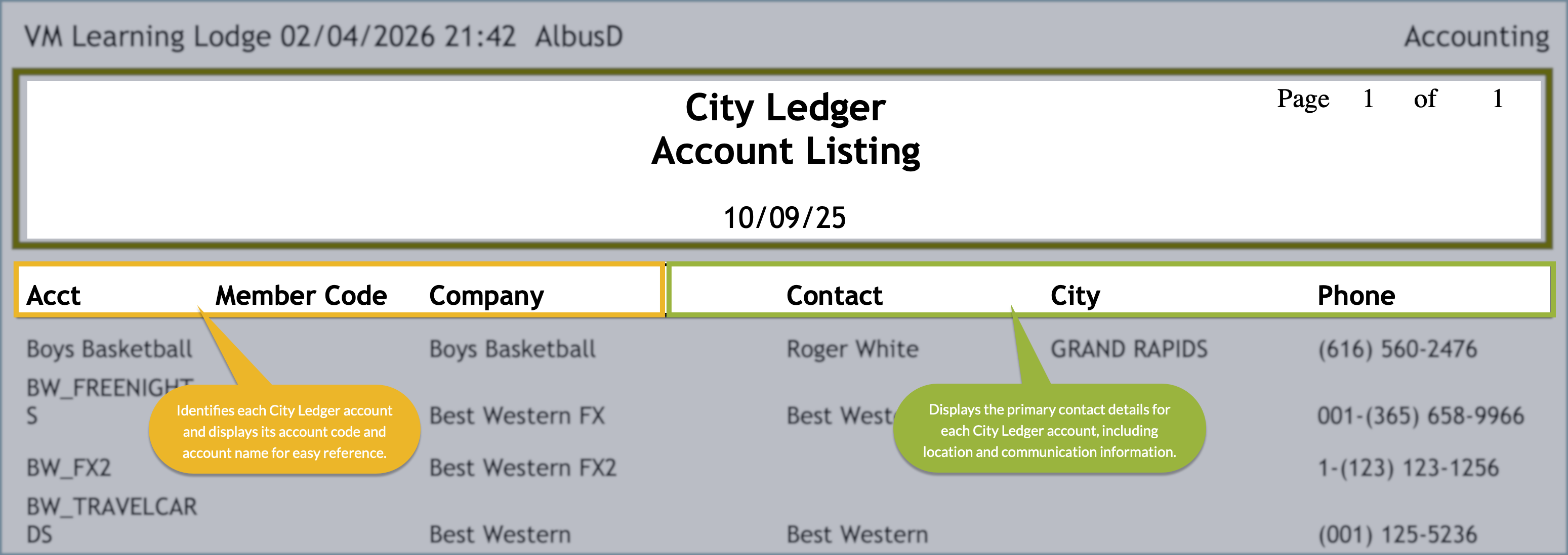 When the City Ledger Account Listing is printed, the report displays a simplified, read-only version of the account list. The printed format organizes City Ledger accounts into clear columns such as account number, member code, company name, contact, city, and phone number.