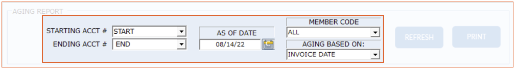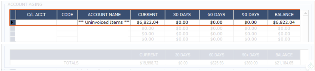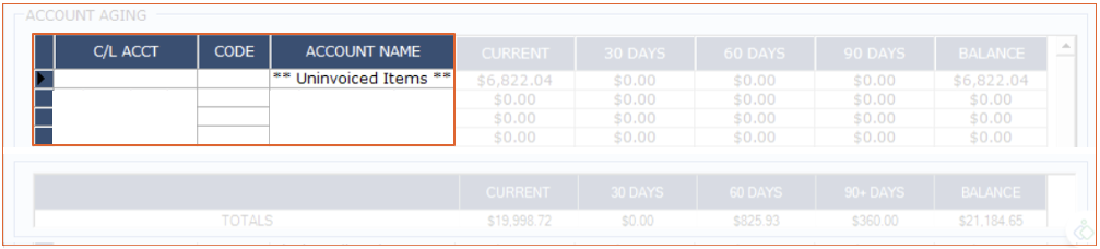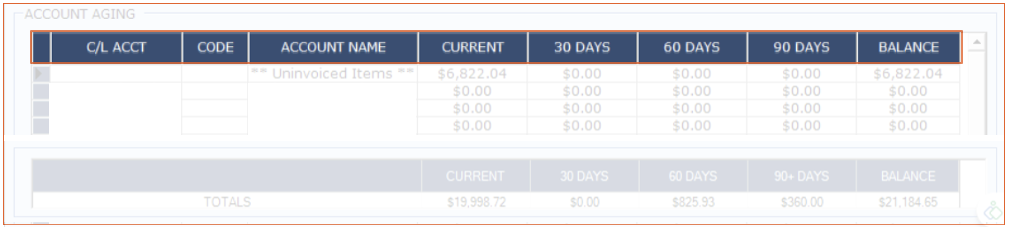 The first section of the Aging report will show the C/L Account number, member code (if attached to one) and the account name.