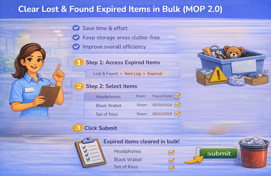 Managing expired Lost & Found items efficiently is key to maintaining an organized system. The bulk clear feature in MOP 2.0 allows properties to quickly remove multiple expired items at once, reducing manual effort and improving operational efficiency. By streamlining this process, teams can spend less time on administrative tasks and more time focusing on guest service.