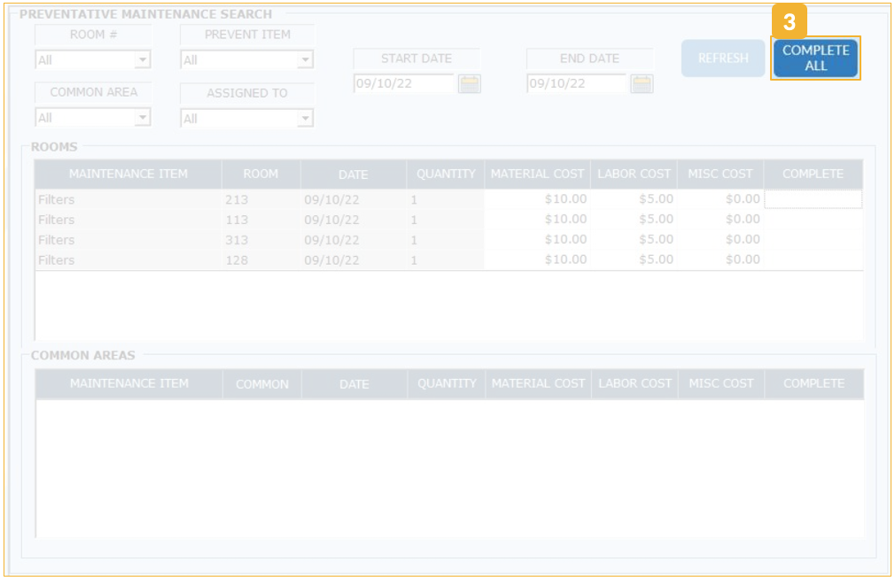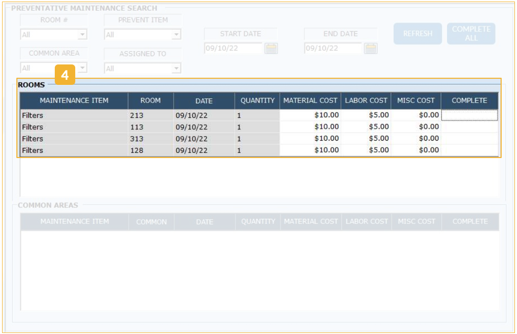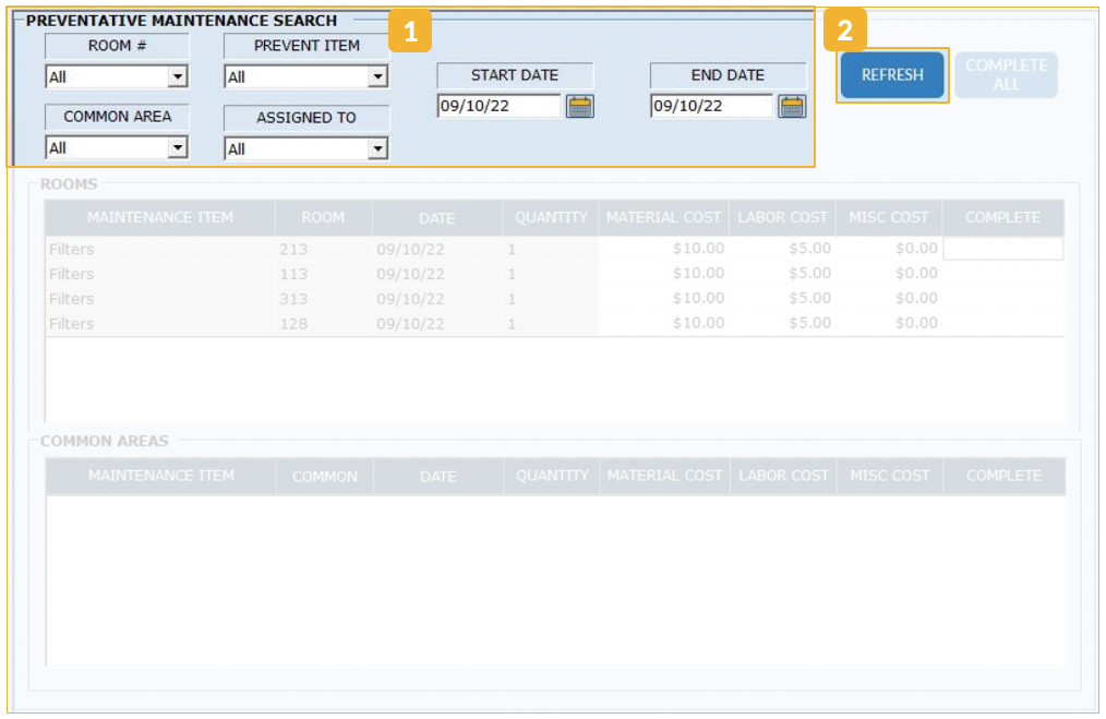 1. Search the work order. Search can be narrowed down with the filters by Rooms, Common Areas, Preventive Maintenance Item, to whom it was Assigned To or by dates.